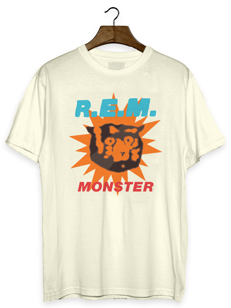 Camiseta com estampa sobre a banda R.E.M. e seu disco Monster.
