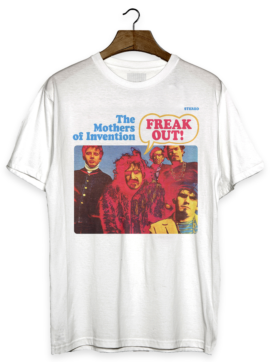 Camiseta com estampa sobre a banda The Mothers Of Invention, de Frank Zappa, e seu disco Freak Out.